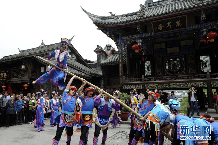 演员在汶川县水磨镇万年台进行民俗表演(2012年5月23日摄)。新华社发(王飞 摄)
